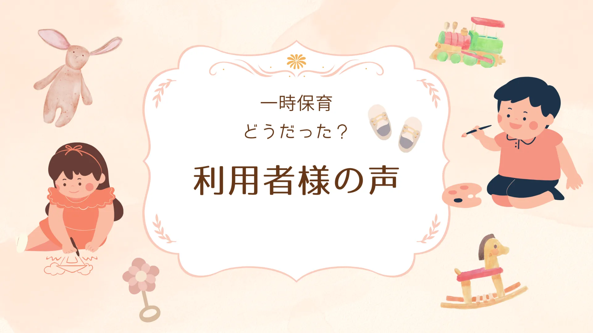 - 実家も遠く、いざという時に頼れる親戚なども近くにいないため、一時保育を利用するようになりました。初めは私と離れることが寂しくて泣くこともありましたが、今ではいつも満面の笑顔で接してくれる先生に子供も信頼している様子です。預けた日の1日の様子もしっかりと書いてくれて、愛情たっぷりで接してくださっているのが良く伝わります。私と子供にとって、本当にありがたい場所です。
