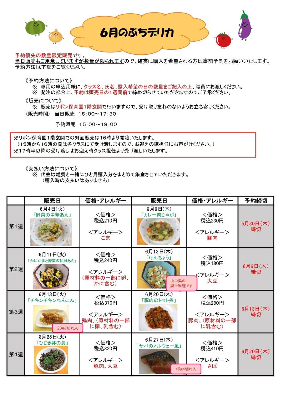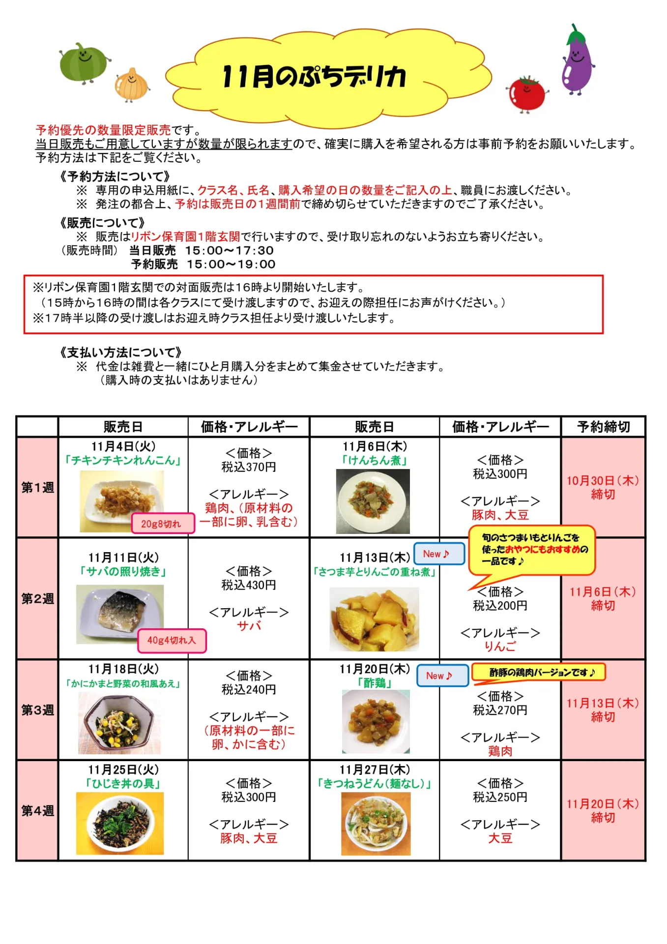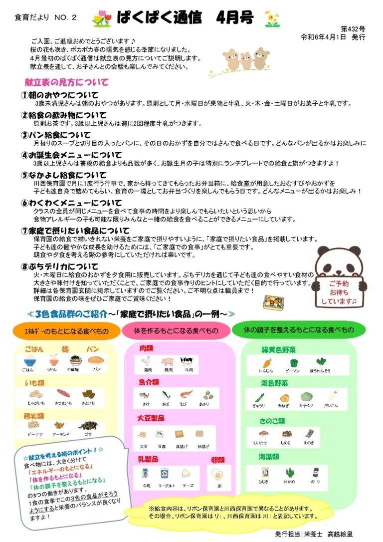 子ども達の食育のために役立つ情報や献立表を掲載しています。子ども達が健やかに成長するためには家庭での食事はとても大切です。家庭でも摂っていただきたい食品等を掲載することで、バランスの取れた食生活を目指します。園でご用意している給食を保護者にも味わっていただけるように、ぷちデリカとして販売しており、子ども達が食べやすい大きさや味付けを知っていただけます。