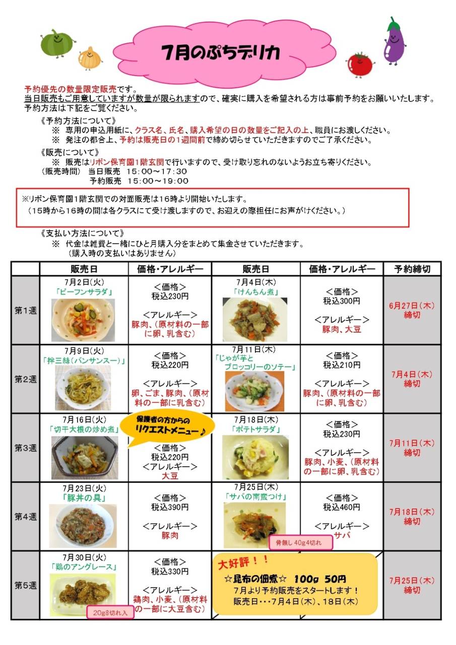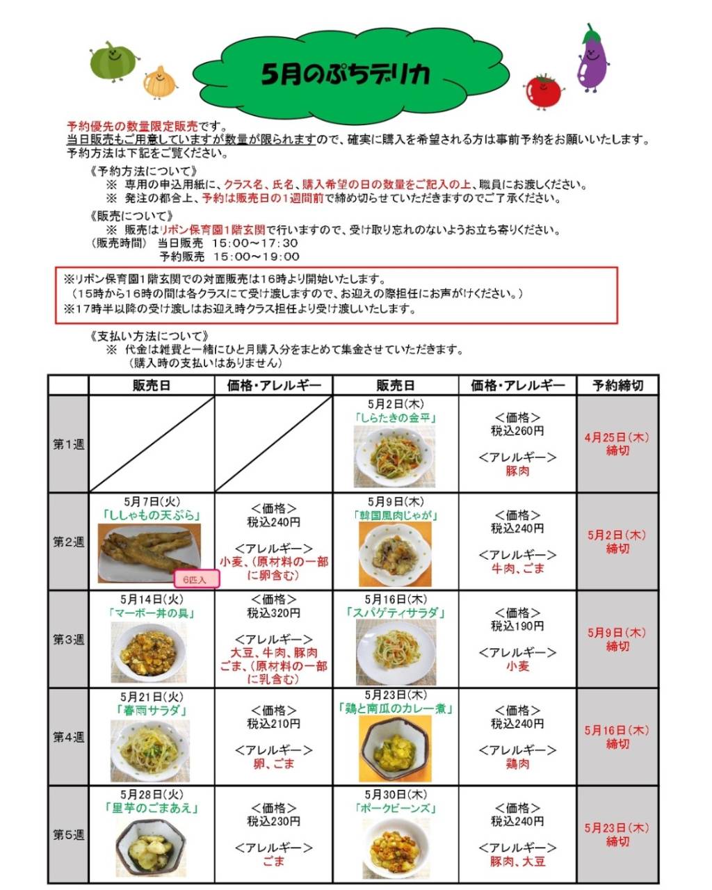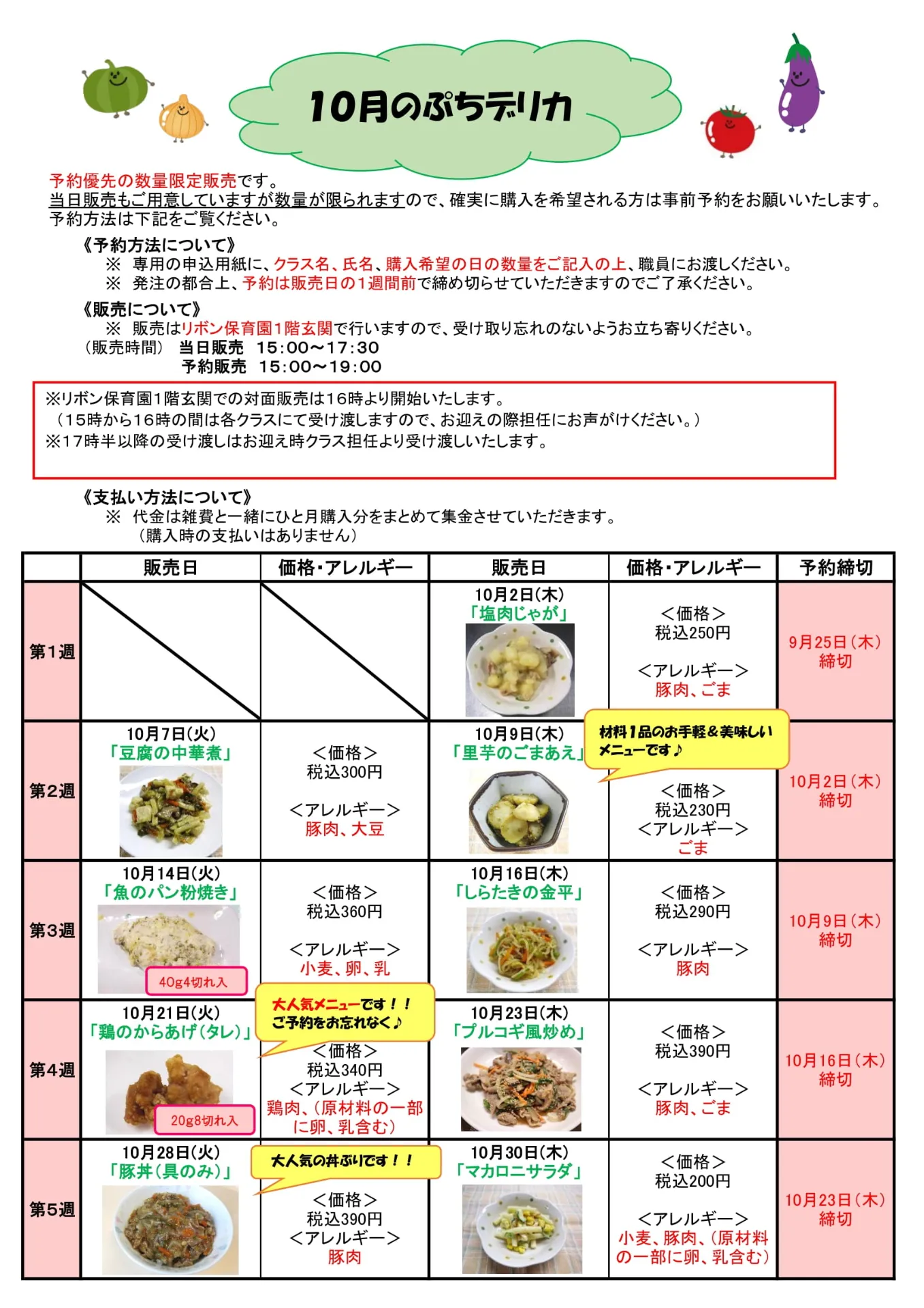 子ども達の食育のために役立つ情報や献立表を掲載しています。子ども達が健やかに成長するためには家庭での食事はとても大切です。家庭でも摂っていただきたい食品等を掲載することで、バランスの取れた食生活を目指します。園でご用意している給食を保護者にも味わっていただけるように、ぷちデリカとして販売しており、子ども達が食べやすい大きさや味付けを知っていただけます。